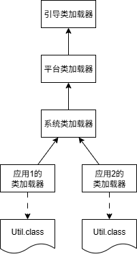 令人惊讶的是,在同一个虚拟机中可以有两个类名和包名都相同的类。实际上,类是由全名和类加载器确定的。这项技术在加载来自多个来源的代码时很有用。例如,应用服务器对于每个应用使用单独的类加载器(如下图所示)。